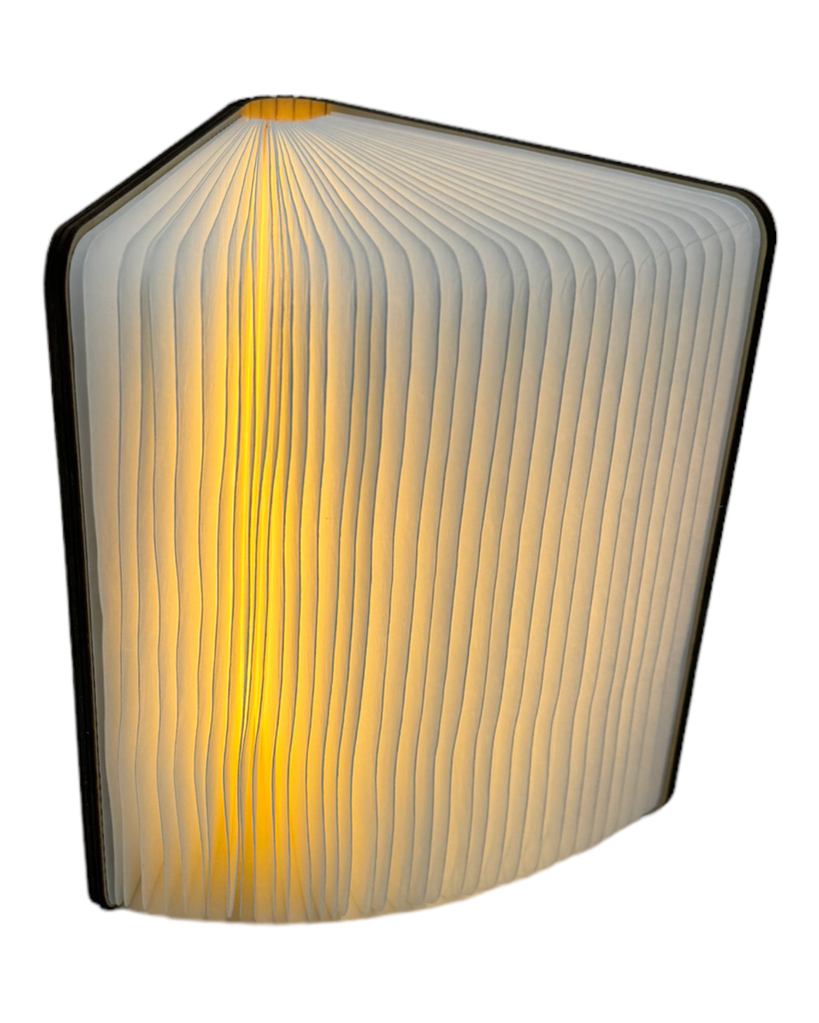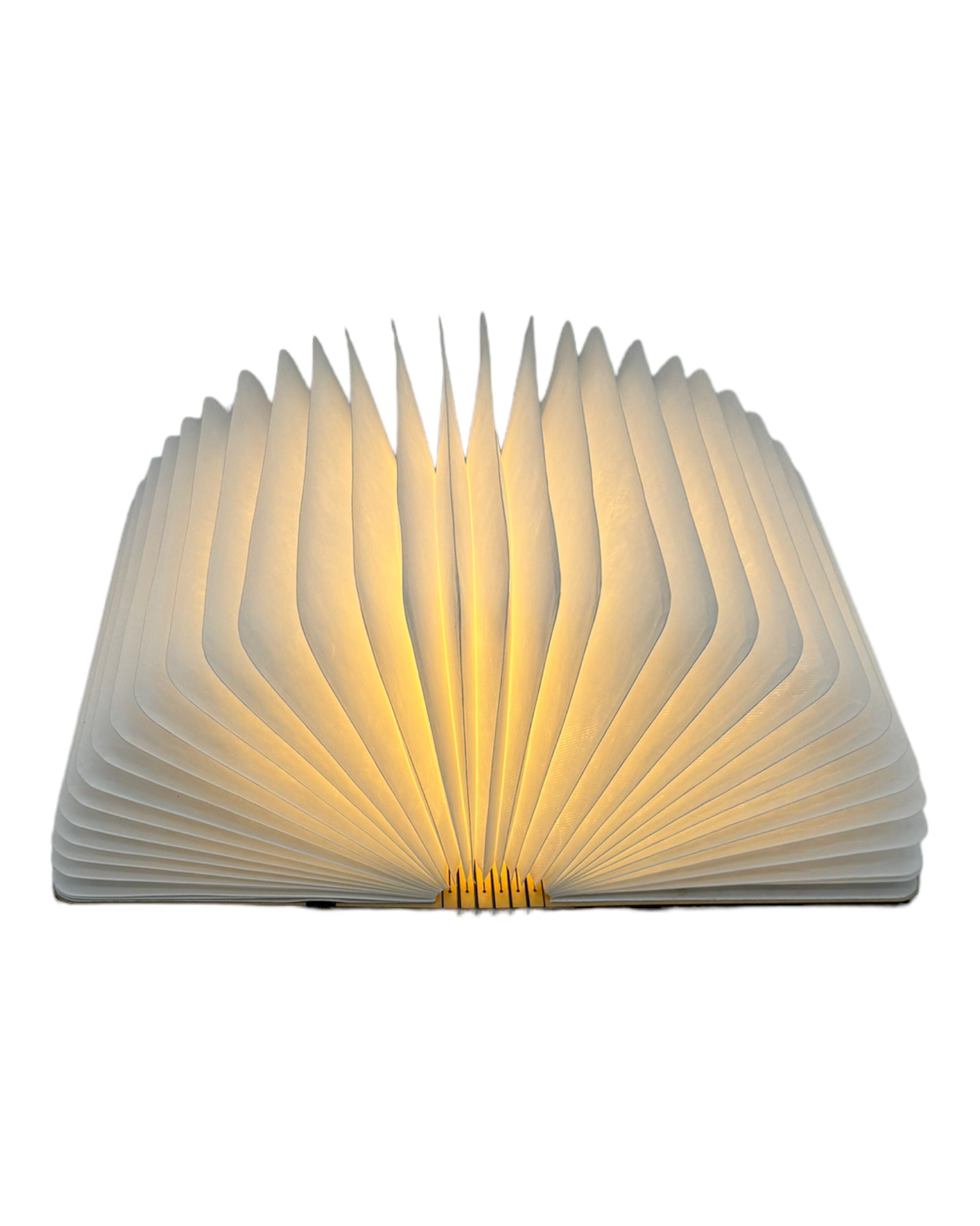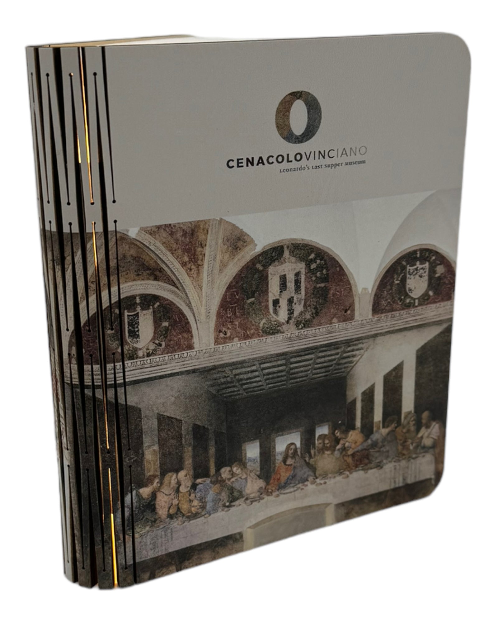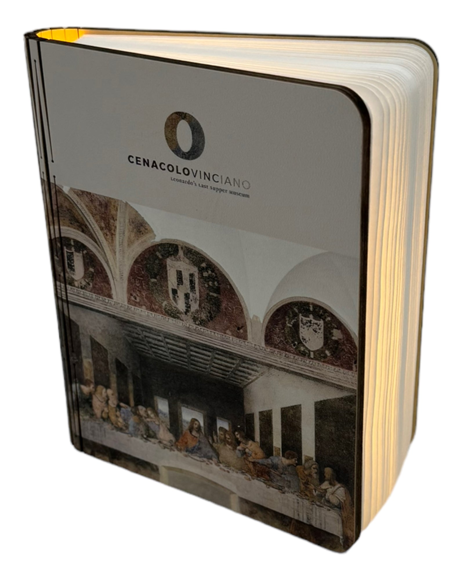 USB rechargeable wireless book-shaped LED lamp with maple wood cover and internal pages in eco-friendly Tyvek paper. It turns on by flicking it for a maximum opening of up to 360 degrees. All-over depiction of Leonardo's Last Supper. measurements: 14x165 cm
