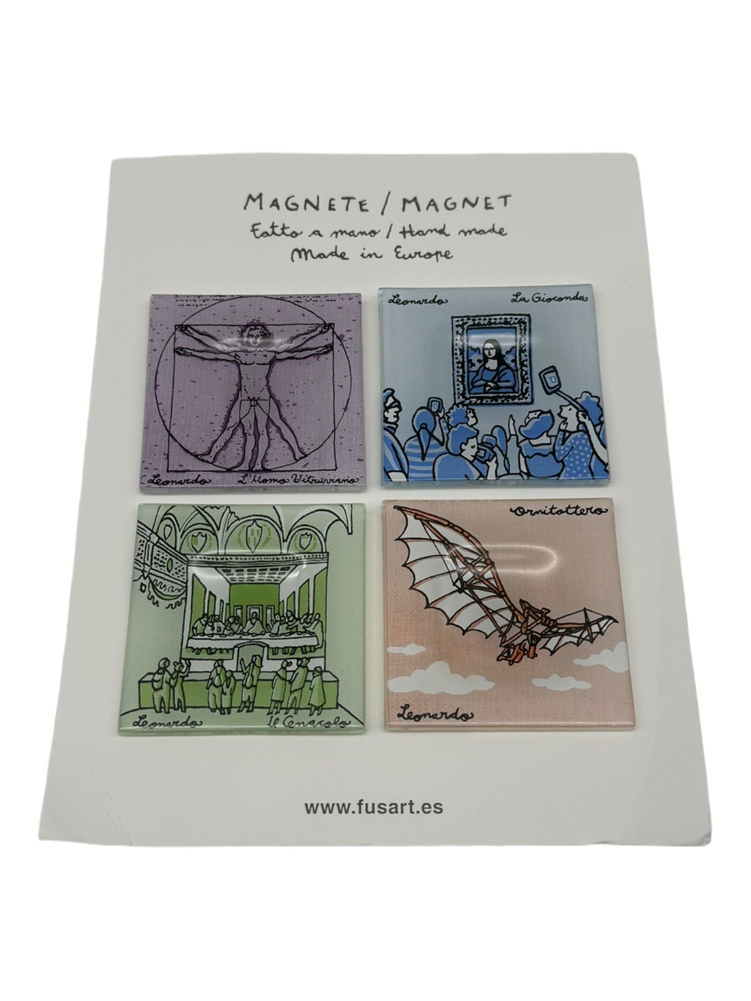 Hand-painted glass magnet. In pack of 4 magnets with Leonardo's subject (Last Supper, Gioconda, Vitruvian Man, Flight). In polybag with cardboard. Single magnet size: 55x55 cm