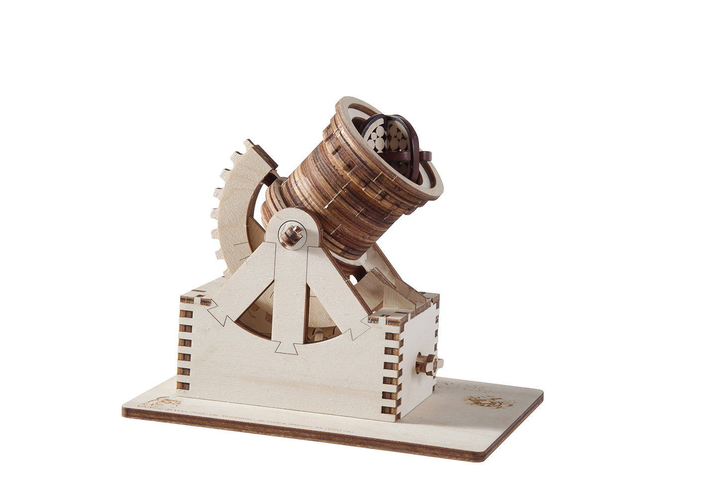 Wooden model inspired by Leonardo's machine drawings supplied in an assembly box with instructions in Italian and English