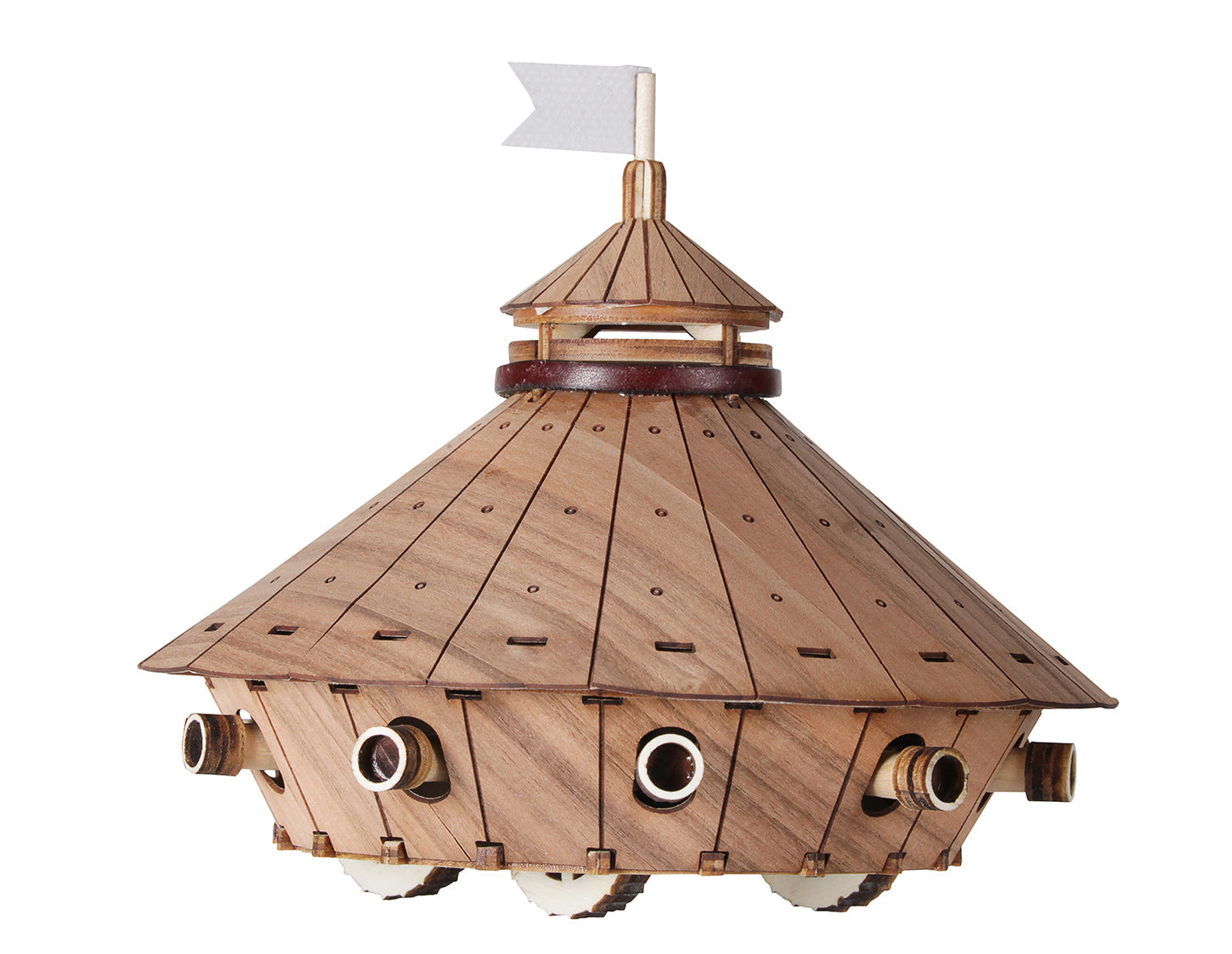 Wooden model inspired by Leonardo's machine drawings supplied in an assembly box with instructions in Italian and English. 71 total items. Measurements of assembled model: ø18 cm h16 cm