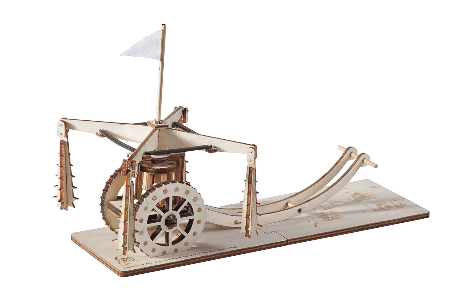 Wooden model inspired by Leonardo's machine drawings supplied in an assembly box with instructions in Italian and English. 71 total items. Measurements of assembled model: 65×195cm h20 cm