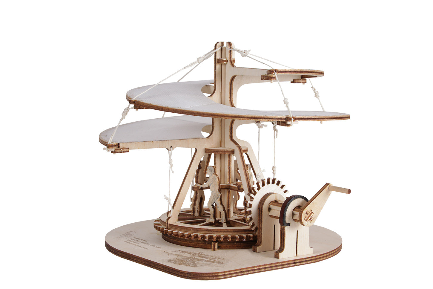 Wooden model inspired by Leonardo's machine drawings supplied in an assembly box with instructions in Italian and English. Measurements of assembled model: 22x22 cm h 17 cm