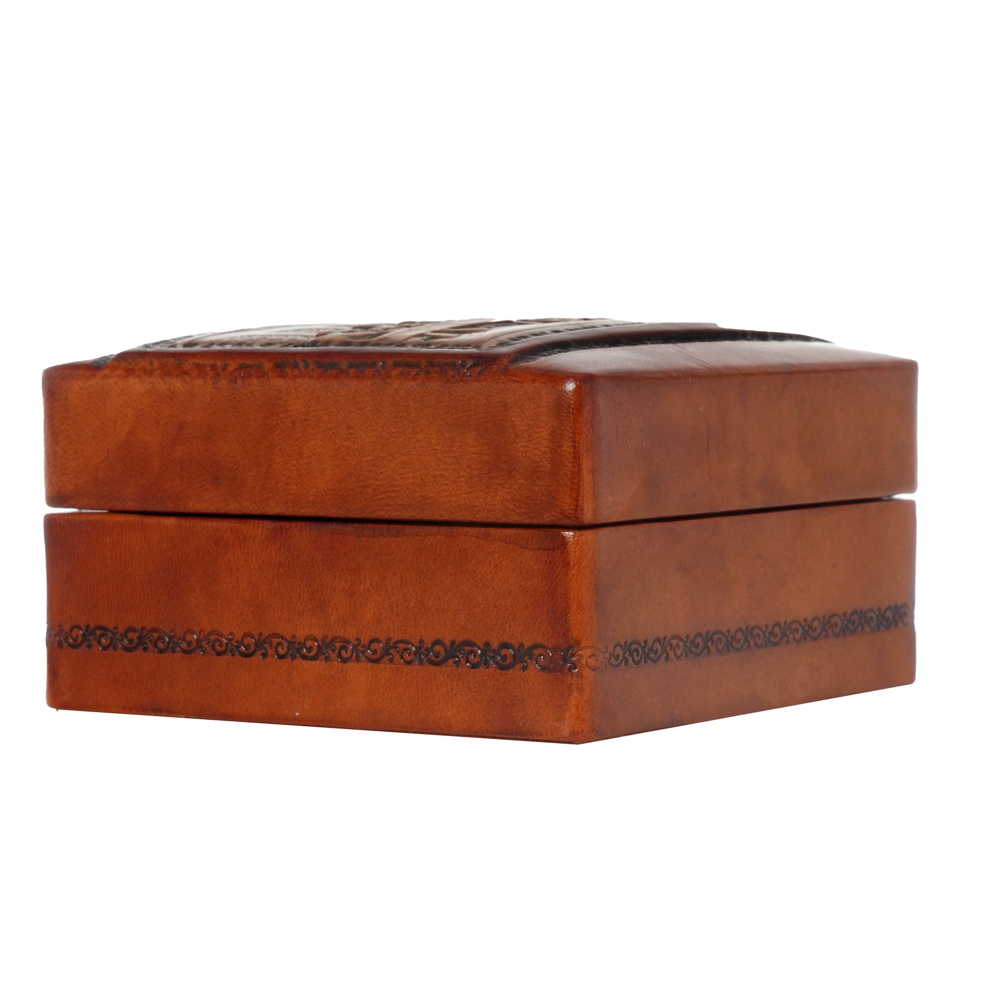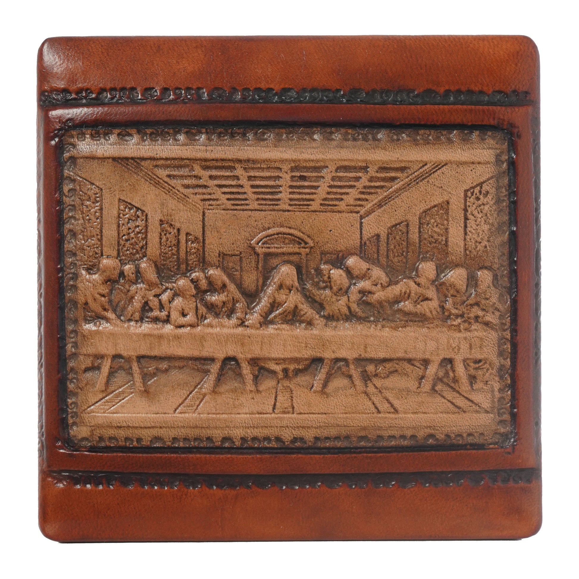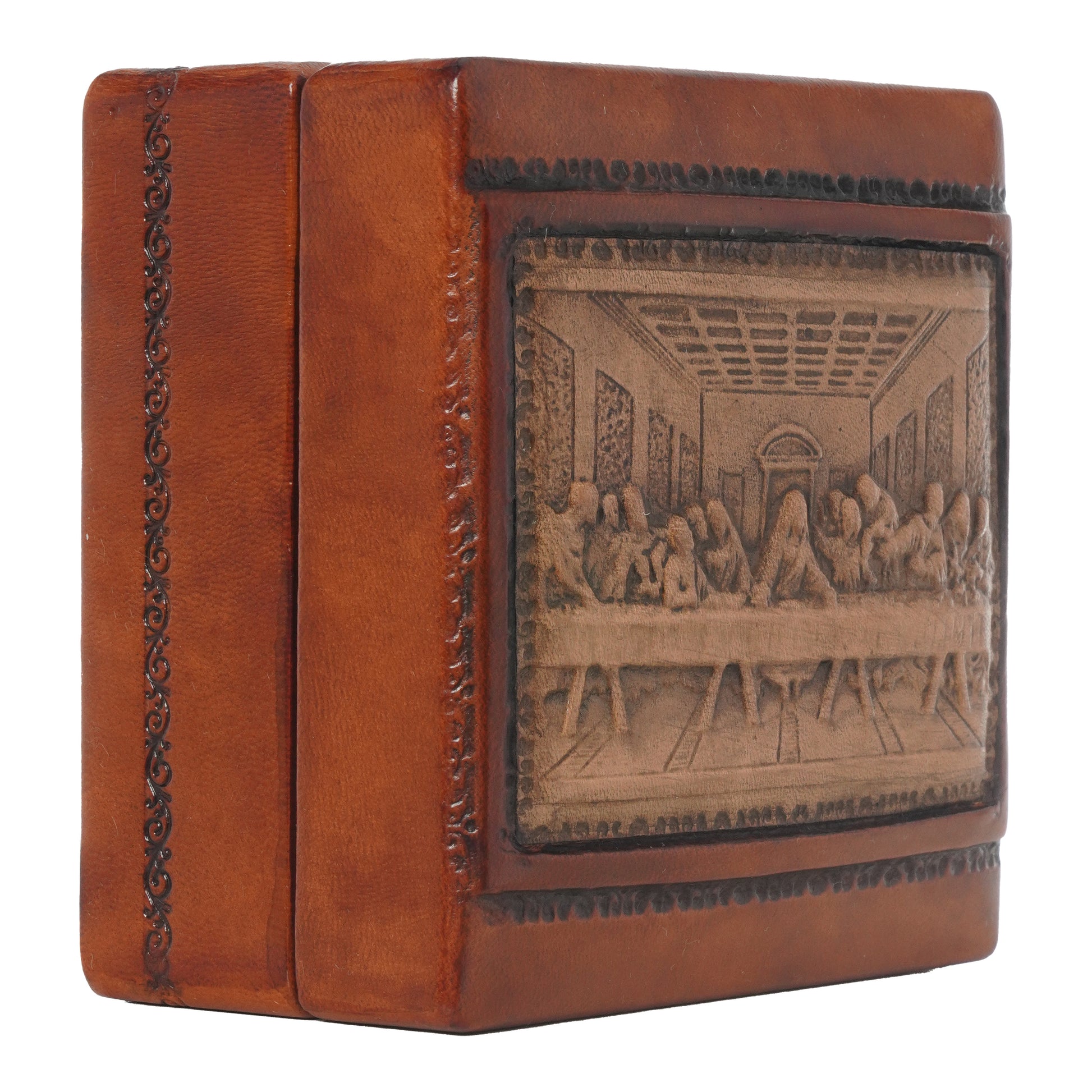 Florentine style jewelry box. Leather exterior, velvet interior. With personalization on the Leonardo Last Supper lid. Measurements 11x11 cm