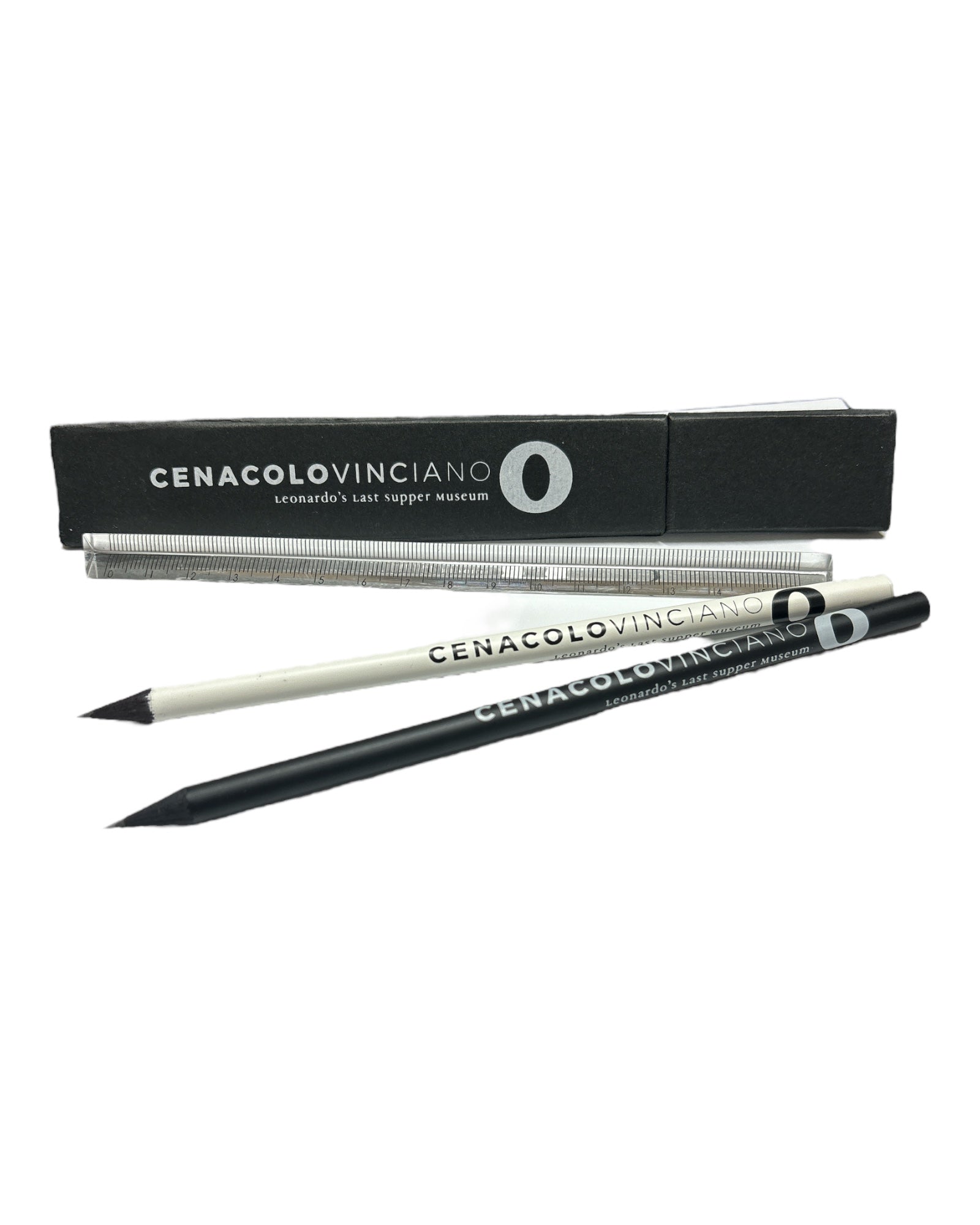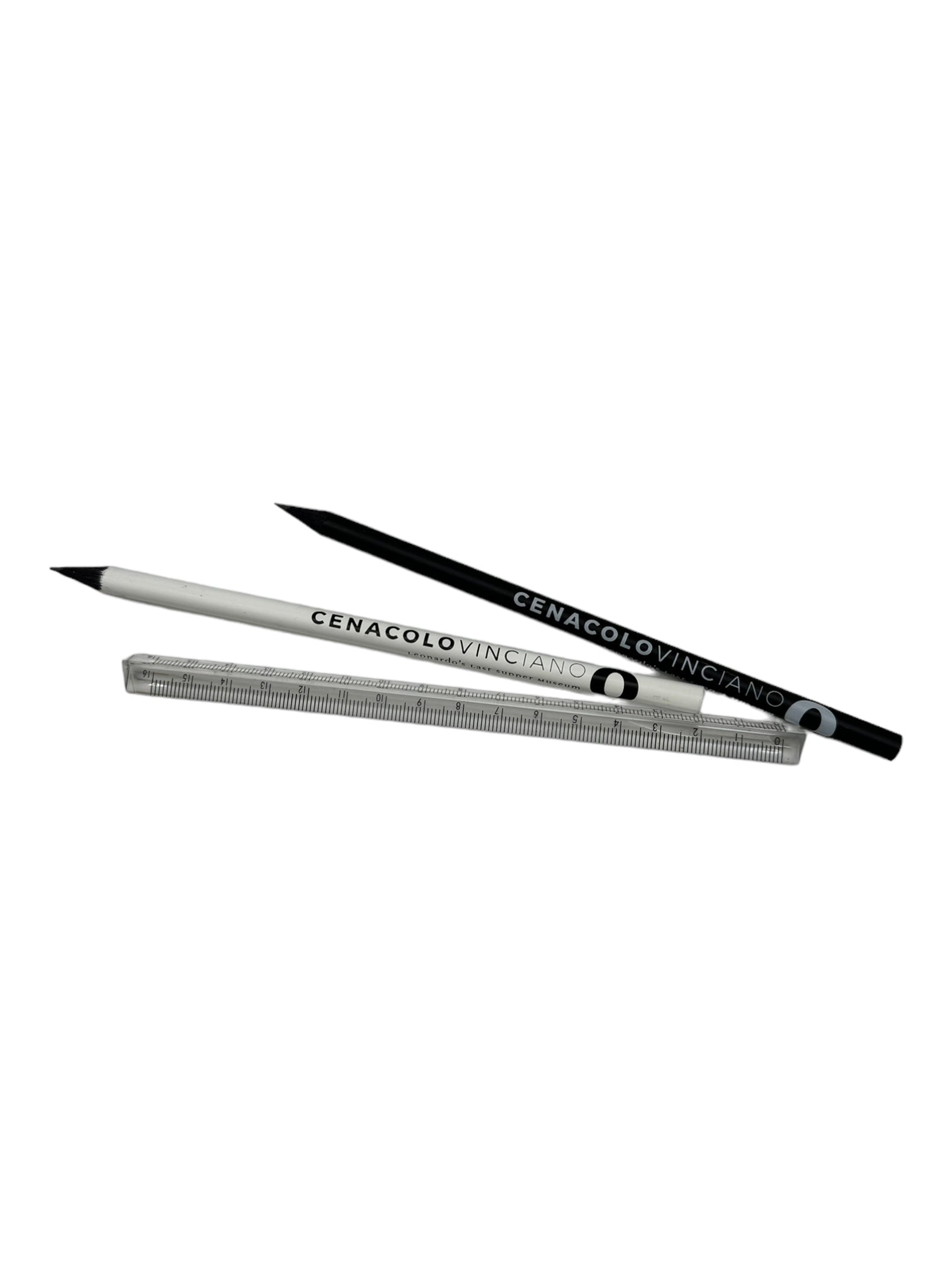 Triangular cardboard case containing 2 pencils with barrel personalized with the Cenacolo Vinciano logo + a transparent ruler. In a gift box with graphics inspired by Leonardo's fresco. Box measurements: 20x26 cm