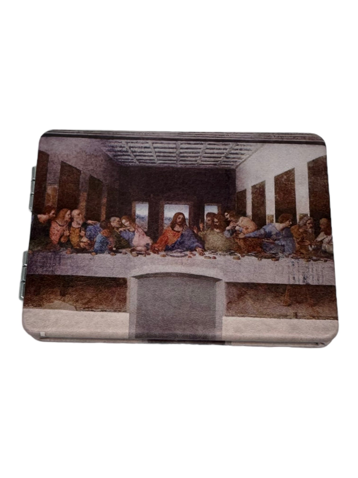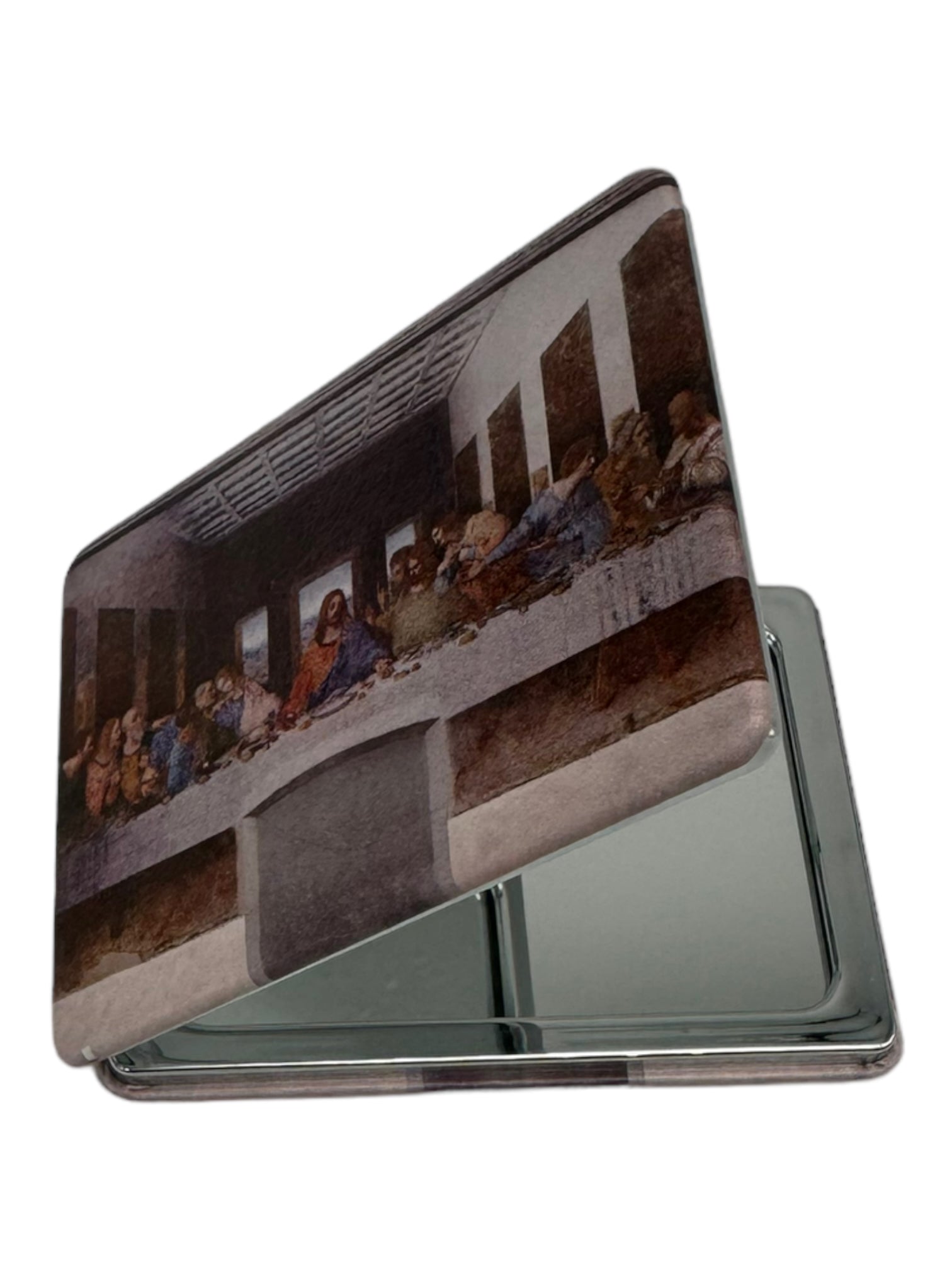 Personalized handbag mirror with Leonardo's Last Supper reproduction. Soft touch material. Measurements: 8x6 cm