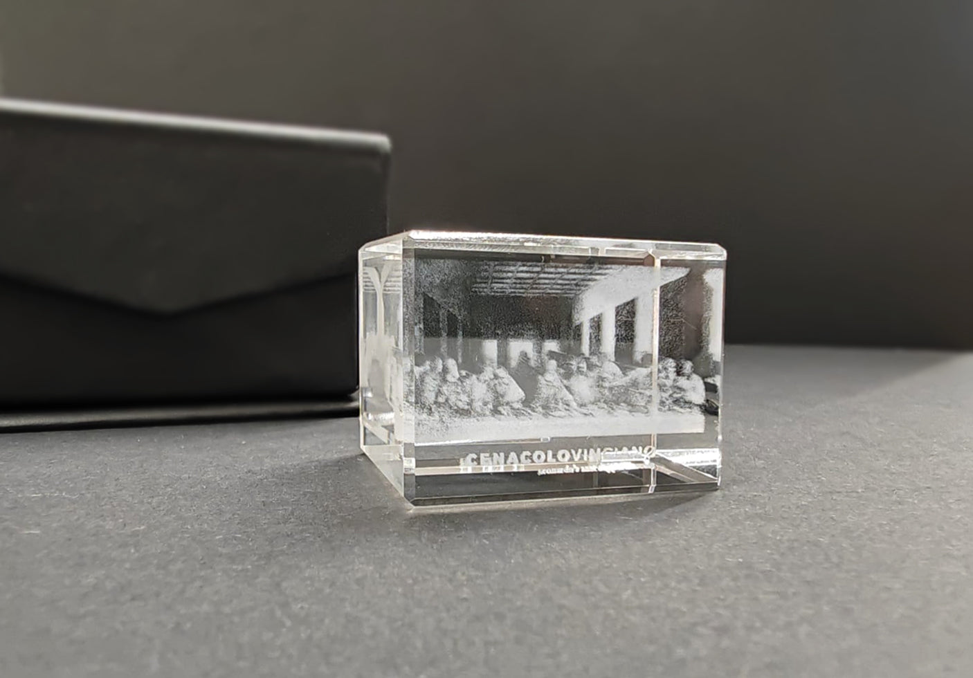 Crystal with 3D laser engraving - Leonardo Last Supper reproduction. In refined gift box with protective sponge. Measurements 3x4x3 cm